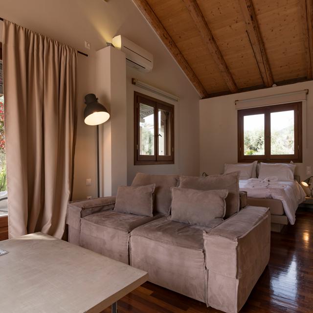 <p>Terwijl ik samen met George door de tuin wandel, valt mijn oog op een bordje: "Vineyard Vertzamo". Verrast kijk ik hem aan. Ik wist niet dat hier een wijngaard was. George glimlacht. "Die was er ooit", vertelt hij. Zijn opa verbouwde hier druiven en maakte wijn, maar toen hij ermee stopte, besloten George en zijn broer iets nieuws te creëren.</p><p>De villa's liggen verscholen in het groen, opgaand in het landschap. Hoge olijfbomen werpen hun schaduw over de terrassen en een zacht briesje laat de bladeren ritselen. Tussen de bomen schittert het privézwembad in de zon, het water lonkt voor een verkoelende duik. De omgeving ademt rust, met kronkelende paadjes die langs de villa's leiden en hier en daar een knusse zithoek. Dit is zo'n plek waar de tijd even stil lijkt te staan.</p>