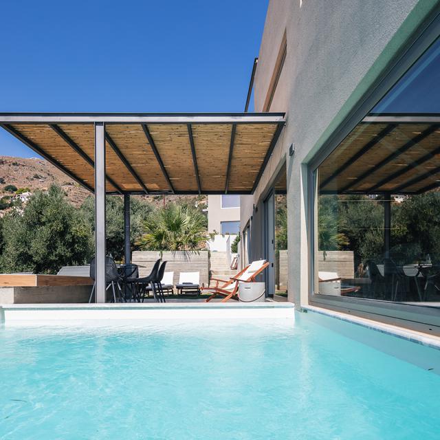 <p><span>Ik adem diep in als ik de deur van mijn villa bij Domus Aestas openzwaai: het licht danst op de witte muren, zachte mediterrane wind fluistert langs de bloemen en op de achtergrond glinstert de Libische Zee in de verte. Het zachte gekabbel van de waterval trekt mijn aandacht - alsof de natuur me vriendelijk toefluistert dat ik mag loslaten. In de schemering, wanneer de lucht vol sterren hangt en de krekels hun avondconcert inzetten, wordt alles nog intenser. De rust, de geuren, het warme licht… Eigenaresse Mariana vertelt me dat dit haar favoriete moment is. “</span><em>The sound of the waterfall helps to clear the mind</em><span>,” zei ze, en ik voel het tot in mijn tenen: deze plek heelt, zonder iets van je te vragen.</span></p><p>Domus Aestas ligt in het dorpje Mariou, in het zuidelijke hart van Kreta, en bestaat uit twee karaktervolle villa's: Villa Myrtia (type A), een intiem toevluchtsoord met privézwembad, en Villa Rodia (type B), iets ruimer, met toegang tot een gedeeld zwembad van 23 m². Beide villa's bieden een adembenemend uitzicht op zee en bergen, en zijn ingericht met natuurlijke materialen, zachte tinten en ramen die het zonlicht uitnodigen. Alles ademt rust. En wie zin heeft in meer beleving, boekt bij Mariana een kookles met lokale recepten of geniet van een Kretenzische wijnproeverij op het terras. Want hier proef je letterlijk en figuurlijk het pure zuiden van het eiland.</p>